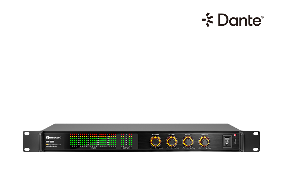 La tarjeta de audio digital DANTE incorporada puede conectar el mezclador a cualquier dispositivo Dante; Sin control de software, se pueden conectar múltiples controladores mezcladores DMC-500 para ajustar el volumen del canal comúnmente utilizado.