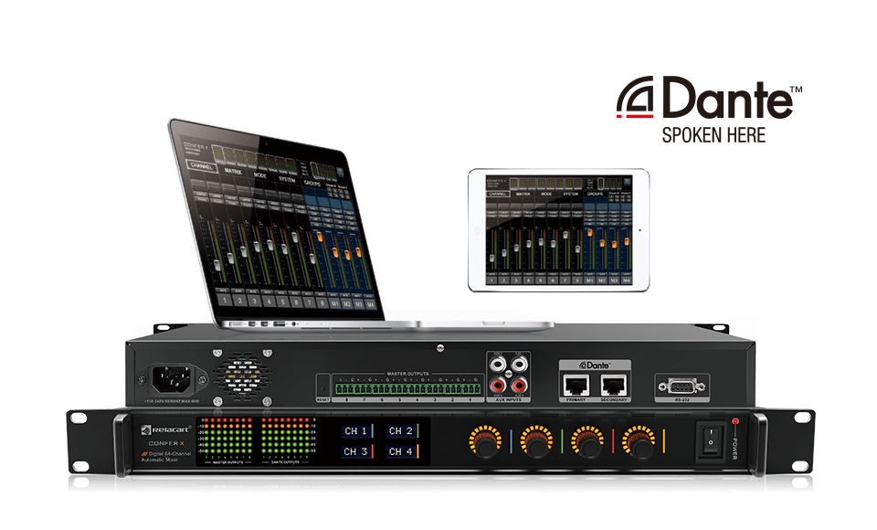 CONFER X es un mezclador automático digital con entrada de 64 canales y salida de 16 canales, desarrollado independientemente por Relacart y la primera creación mundial. El control matricial híbrido digital DANTE y analógico de 64 canales de entrada, 16 canales de salida analógicos son adecuados para ingeniería de aplicaciones más amplias.