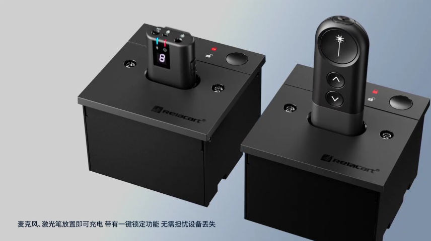 Además, el sistema está equipado con un lápiz láser con función de cambio de página y un estuche de carga con función de bloqueo. Simplemente conéctese a la consola central para monitorear la información del micrófono, detectar automáticamente la localización del dispositivo, batería baja, etc., sin preocuparse por la administración del dispositivo.