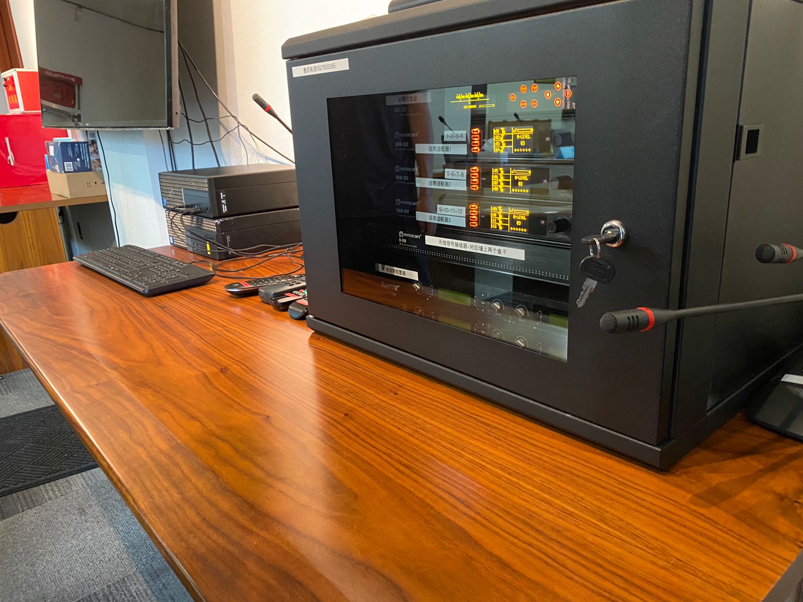 Además, dado que la sala de conferencias utiliza múltiples sistemas de mezcla inalámbricos inteligentes de diversidad verdadera WAM-432, el personal también está equipado con un sistema de control central integrado de audio y video AMC-20, 5 entradas de mezcla de audio balanceadas y 1 salida de mezcla balanceada; 5 interfaces RJ11 de datos del mezclador, 4 entradas de video HD y 1 salida de video HD, dos interfaces de control de cámara y los mezcladores conectados pueden calcular y configurar automáticamente frecuencias que no interfieran entre sí.